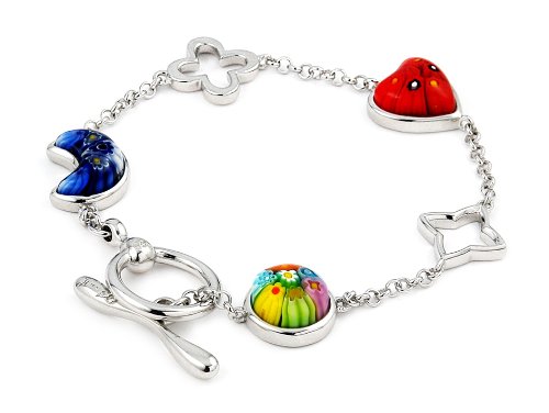 Nickel-free sterling silver bracelet of our Millefiori line featuring, multi color and multi shape design (heart/circle/moon). Also includes a rhodium plate finish, which gives it its lustrous white gold appearance. Millefiori is a type of Murano glass that has been incorporated with various layers of colors to create beautiful flower-like patterns. Millefiori, which literally means "a thousand fl